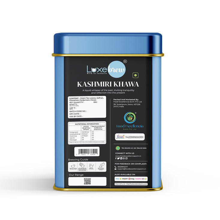 Luxebrew Kashmiri Kahwa Tea recreates the royal Kashmiri kahwa experience: green tea base infused with saffron, cinnamon, cardamom, and occasionally almonds or other spices. The brew is warm golden-green with rich fragrance. Subtle sweetness and spice interplay on the palate, evoking Himalayan culture and serenity in each sip.