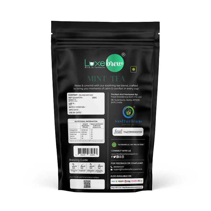 Luxebrew Mint Tea marries premium herbal mint leaves (or mint-blended tea leaves) with a refreshing, invigorating profile. On brewing, the liquor is pale, fragrant, and cool. The taste is crisp, green-mint forward, with a lingering breath-freshening quality. Ideal any time you desire refreshment or digestive ease.